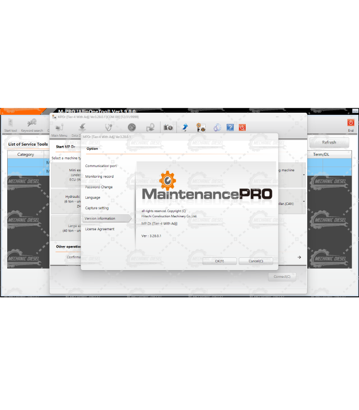 Hitachi Allinone Tool & MDPR is a diagnostic software for heavy machinery. Includes tools such as maintanance pro security/browsetool, mpdr & mpviewer main menu.